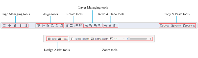The layout tools can help you manage the embed objects more easily while designing the flipbook. These tools include Page Managing tools, Align tools, Rotate tools, Layer Managing tools, Redo & Undo tools, Copy & Paste tools, Design Assist tools (Grid & Ruler) and Zoom tools.