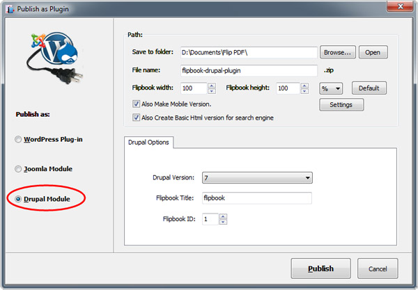 Set flipbook title, width and height for the Drupal module and then select version for the Drupal version and set flipbook ID. And after you publish the module, you can embed the flipbook to Drupal site.