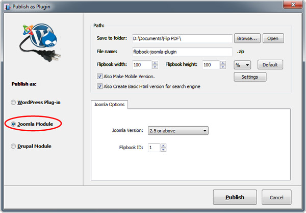 Set flipbook width and height for the Joomal module, and you can also select Joomla version and set flipbook ID. Insert flipbook module to Joomla site.