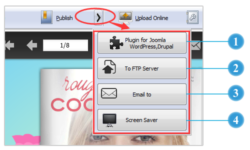 If you click the "Arrow" icon, you can publish the book as plugin for WordPress/Joomla/Drupal, upload to your website using built-in FTP Server, send e-mail directly or create screen saver.