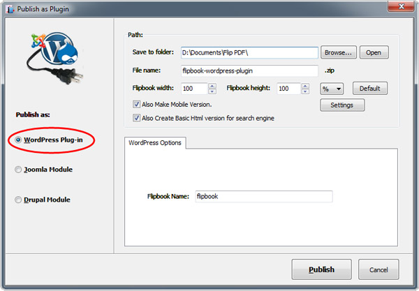 You can customize width and height for the WordPress plug-in. Besides, you can create mobile version and basic HTML version at the same time. And after you publish the plug-in, you can install it to WordPress.